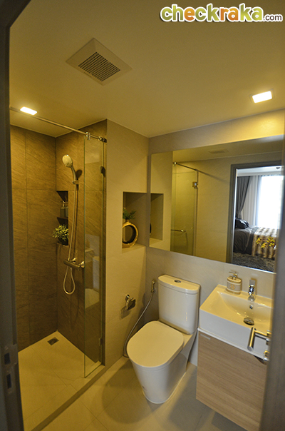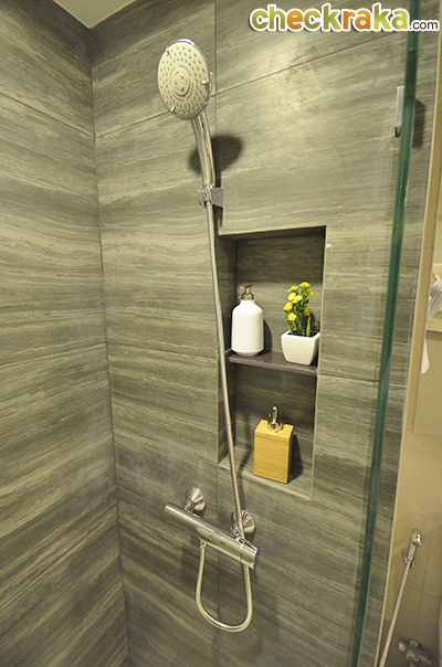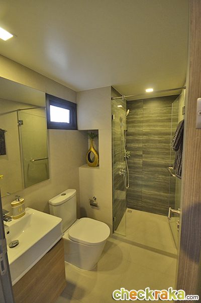 ส่วนเปียกเป็นกระเบื้องสีเทา เจาะช่องสำหรับวางอุปกรณ์อาบน้ำ 2 ช่องพอดีๆ