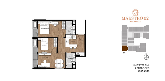B1-1 : พื้นที่ใช้สอย 58.07 ตร.ม. (คลิกเพื่อชมตัวอย่างแปลน)