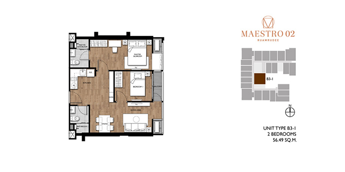 ตัวอย่าง ห้องแบบ 2 ห้องนอน 2 ห้องน้ำ - พื้นที่ใช้สอย 56.49 ตร.ม.