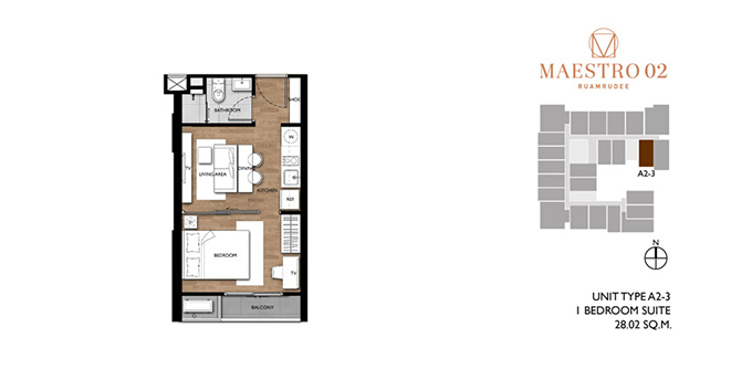 A2-3 : พื้นที่ใช้สอย 28.02 ตร.ม. (คลิกเพื่อชมตัวอย่างแปลน)
