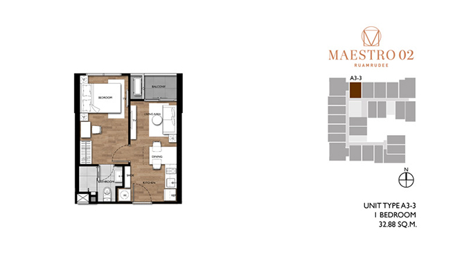A3-3 : พื้นที่ใช้สอย 32.88 ตร.ม. (คลิกเพื่อมชมตัวอย่างแปลน)