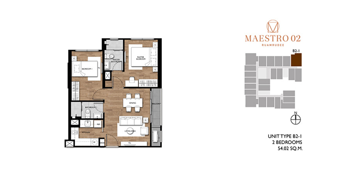 B2-1 : พื้นที่ใช้สอย 54.02 ตร.ม. (คลิกเพื่อชมตัวอย่างแปลน)