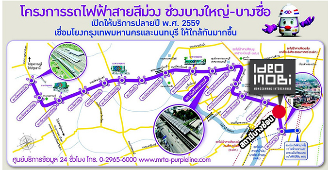 ปัจจุบัน (6 ก.ค. 2559) รถไฟฟ้าสายสีม่วงสร้างเสร็จเรียบร้อยแล้วค่ะ แต่ยังอยู่ในช่วงทดลองวิ่งอยู่ คาดว่าจะเปิดให้บริการอย่างเป็นทางการในเดือน ส.ค. 2559 นี้ ซึ่งหากรถไฟฟ้าเปิดให้บริการ สามารถลง "สถานีบางซ่อน" แล้วเดินเท้าไปโครงการได้สบายๆ เพียง 11 เมตร เท่านั้นค่ะ