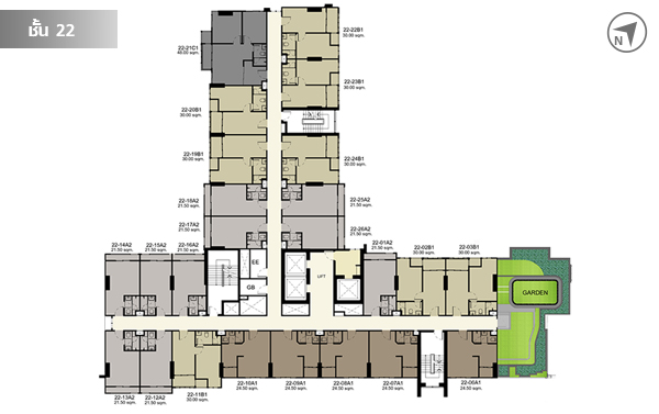 ชั้น 22 มีห้องพักอาศัยทั้งหมด 24 ยูนิต มีสวนหย่อมเล็กๆ อยู่ทางทิศตะวันออกด้วยค่ะ