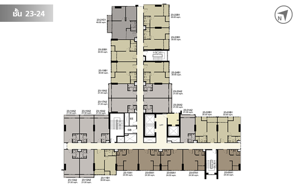ชั้น 23 - 24 แต่ละชั้นมีห้องพักอาศัยชั้นละ 24 ชั้น รวม 48 ชั้น