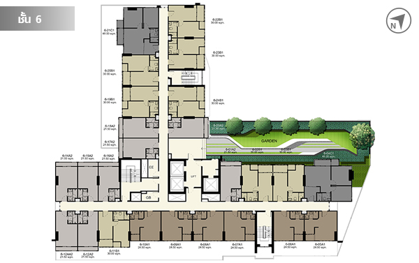 ชั้น 6 มีห้องพักอาศัยทั้งหมด 25 ยูนิต ชั้นนี้มีสวนหย่อมไว้ให้พักผ่อนหย่อนใจด้วยค่ะ