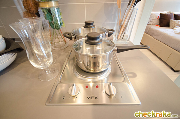 ทางโครงการให้เคาน์เตอร์ครัวมาค่ะ ประกอบด้วยชั้นวางของด้านบนและด้านล่าง ซิงค์ล้างจาน เตาไฟฟ้า 2 หัว