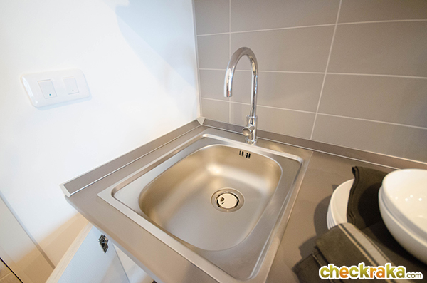 ซิงค์ล้างจาน ผนังด้านหน้าเป็นกระเบื้องกันเปื้อน แต่ด้านข้างเป็นผนังสีขาวเวลาล้างจานควรระวังนิดนึงค่ะ
