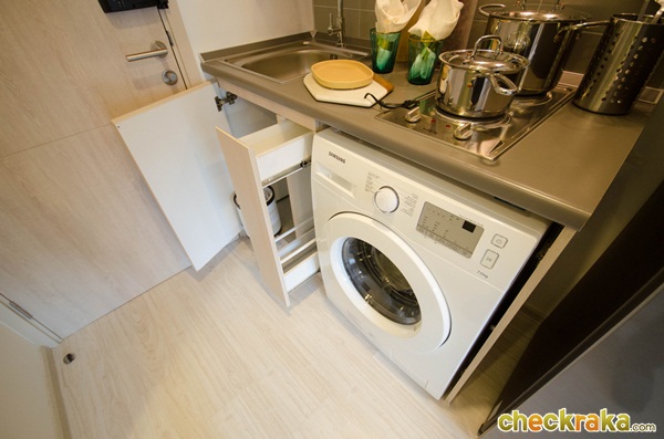 เคาน์เตอร์ครัวด้านล่าง มีช่องเก็บของ 3 ช่อง และมีพื้นที่ไว้สำหรับวางเครื่องซักผ้าตามภาพเลยค่ะ