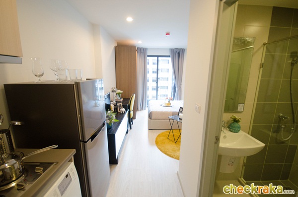 เปิดประตูเข้ามาจะเห็นห้องน้ำอยู่ขวามือ เคาน์เตอร์ครัวอยู่ด้านซ้ายมือ ตรงเข้าไปจะเป็นพื้นที่นั่งเล่นและเตียงนอน