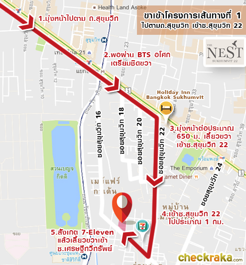 เลี้ยวเข้าซอยสุขุมวิท 22 เข้ามา ที่แรกที่เจอคือ โรงแรม Holiday Inn ค่ะ (ห่างจากโครงการประมาณ 1 กิโลเมตร)