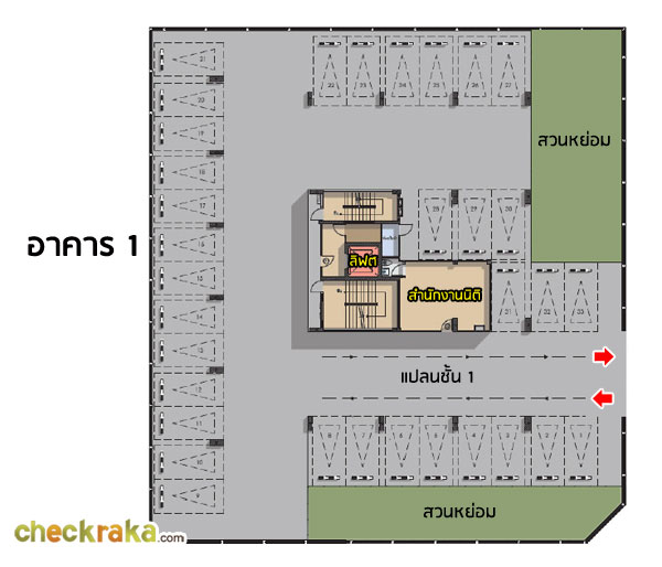 - พื้นที่จอดรถอยู่ที่บริเวณชั้น 1 ของทุกอาคาร อาคารละประมาณ 33 คัน แบบไม่รวมจอดซ้อนคัน