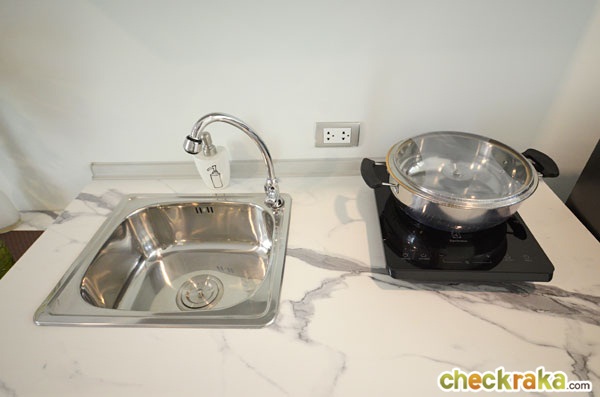 เคาน์เตอร์ครัวได้เป็นลายหินอ่อนเหมือนกันกับโต๊ะทานข้าว