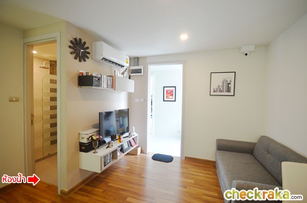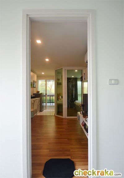 เข้ามาภายในห้องจะเจอกับส่วนของห้องนั่งเล่นก่อนเลยค่ะ ความสูงจากพื้นถึงเพดานอยู่ที่ 2.4 เมตร