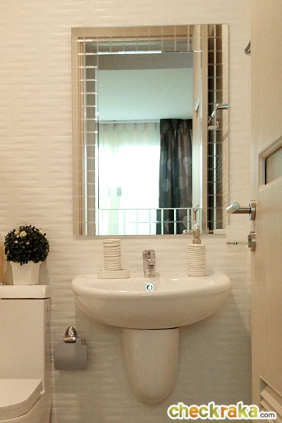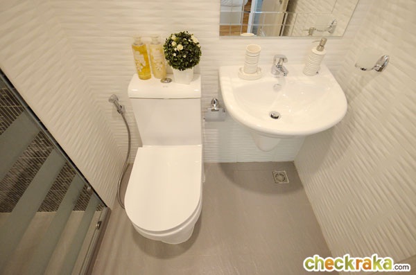 แบ่งพื้นที่ส่วนแห้งส่วนเปียกให้เรียบร้อย ทางโครงการติดฉากกั้นอาบน้ำบานเดี่ยวแบบติดตายมาให้ แต่ถ้าจะให้ดีแนะนำให้ติดเป็นแบบเต็มบาน หรือแบบบานเลื่อนจะช่วยป้องกันการกระเด็นของน้ำได้ดีกว่า