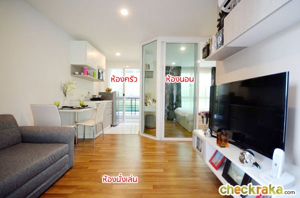 และห้องตัวอย่างที่จะพาไปชมกันนั้นเป็นห้องแบบ 1 ห้องนอน Type A ขนาดประมาณ 28.45 ตร.ม. โดย Layout ของห้องจะแบ่งพื้นที่ออกเป็น 4 ส่วนหลักๆ คือห้องนั่งเล่น ห้องครัว ห้องนอน และห้องน้ำ โดยห้องนอนมีพื้นที่ค่อนข้างใหญ่ทำให้ห้องดูกว้างสบาย และไม่รู้สึกอึดอัด ภายในห้องตัวอย่างตกแต่งเฟอร์นิเจอร์มาให้ครบแบบ Fully furnished ซึ่งสิ่งที่เห็นในห้องตัวอย่างนั้นลูกค้าจะได้ตามแบบนี้ทั้งหมดเลยค่ะ ยกเว้นเครื่องใช้ไฟฟ้า และของตกแต่งเท่านั้นที่จะไม่ได้ ตามเราไปดูห้องตัวอย่างกันค่ะ