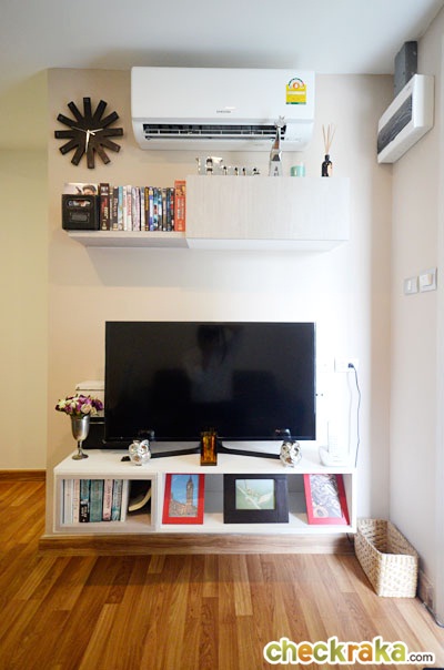 เข้ามาทางด้านขวามือจะเป็นชั้นวางทีวี พร้อมที่ชั้นวางของ และตู้ลอยติดผนังด้านบน บานพับเป็นแบบ Soft close