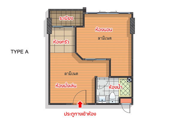 - ห้องแบบ 1 ห้องนอน Type A พื้นที่ใช้สอย 28.45 - 29.41 ตร.ม.