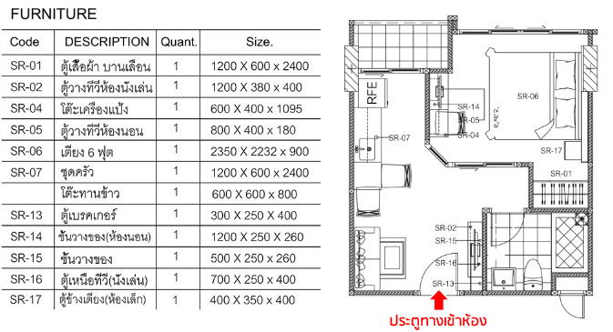 - แบบ 1 ห้องนอน ขนาด 28.45 ตร.ม. ราคาเริ่มต้น 1.49 ล้านบาท (ราคาห้องเปล่า)