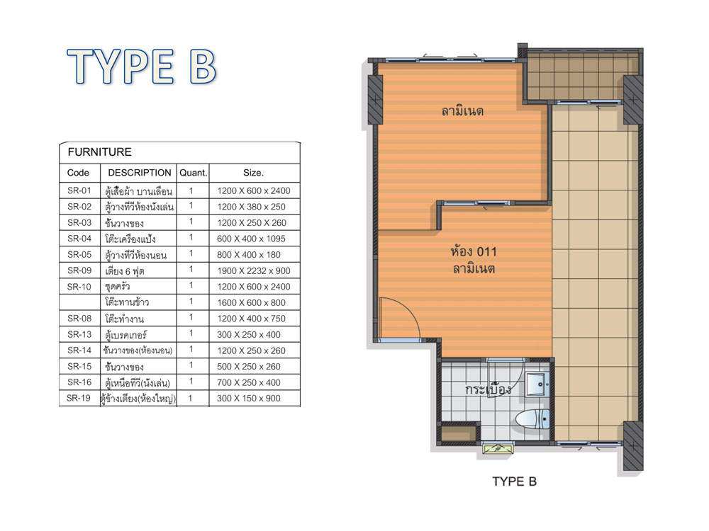 (คลิกเพื่อชมตัวอย่างแปลนห้องขนาดใหญ่) - ห้องแบบ 1 ห้องนอน Type B พื้นที่ใช้สอย 37.69 ตร.ม.