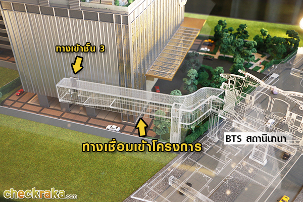 มีทางเชื่อมเข้าตัวอาคาร ซึ่งได้รับการอนุมัติเรียบร้อยแล้ว มี Access Card กั้นอยู่ด้านหน้าเพื่อเดินลัดจาก BTS เข้าไปยังตัวอาคาร โดยจะเดินไปทะลุที่บริเวณชั้น 3 ซึ่งเป็นอาคารจอดรถ จากนั้นลูกบ้านก็ขึ้นลิฟต์ต่อไปยังห้องพักได้เลย