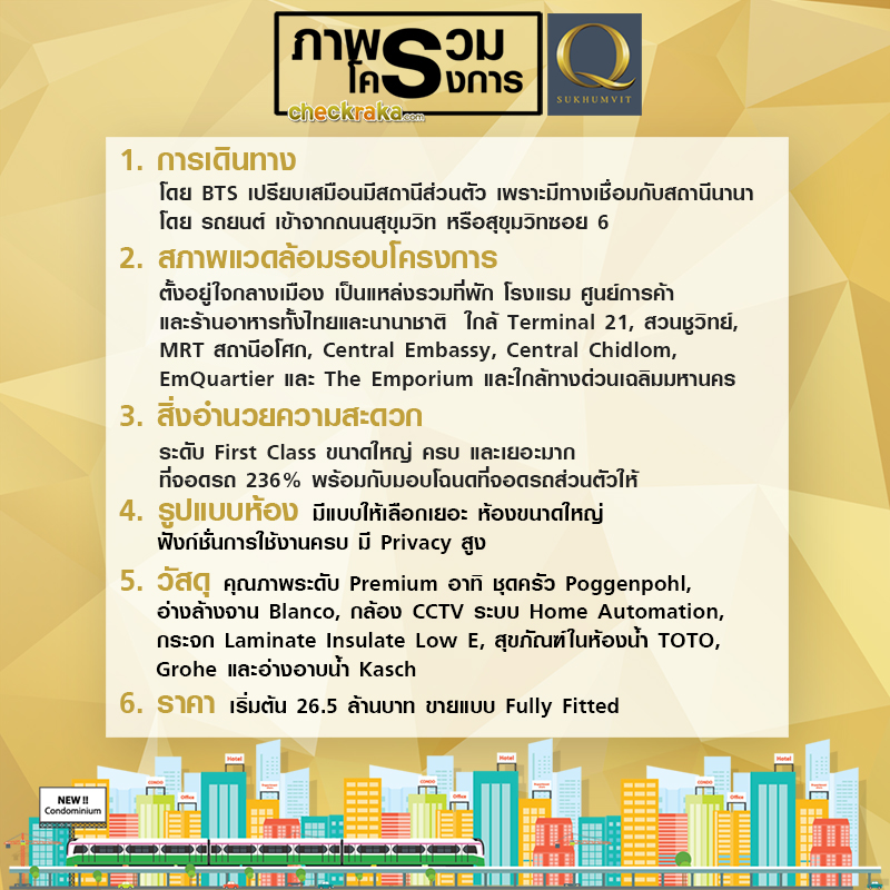 วันนี้ CheckRaka.com จะพาทุกท่านไปรีวิว-เยี่ยมชมโครงการ "คิว สุขุมวิท" Super Luxury Condominium สุดหรูซึ่งเป็นโครงการใหม่ล่าสุดจาก บริษัท ควอลิตี้เฮ้าส์ จำกัด (มหาชน) โปรเจคใหญ่ที่มีมูลค่ากว่าหมื่นล้านที่จะมอบ Lifestyle ระดับ Exclusive ให้กับลูกบ้าน โดดเด่นด้วยทำเลที่ตั้งที่อยู่ติดริมถนนสุขุมวิท และติดรถไฟฟ้า BTS นานา พร้อมทางเชื่อมส่วนตัวจากสถานีรถไฟฟ้าสู่โครงการ นอกจากนี้ยังมาพร้อมกับสิ่งอำนวยความสะดวกส่วนกลางระดับ First Class และที่จอดรถมากถึง 645 คัน คิดเป็นมากกว่า 236% ของจำนวนยูนิตทั้งหมด ภายในโครงการจะหรูหราอลังการขนาดไหนเดี๋ยวตามไปชมกันค่ะ