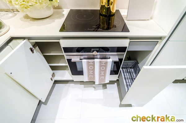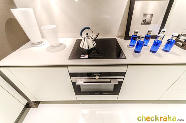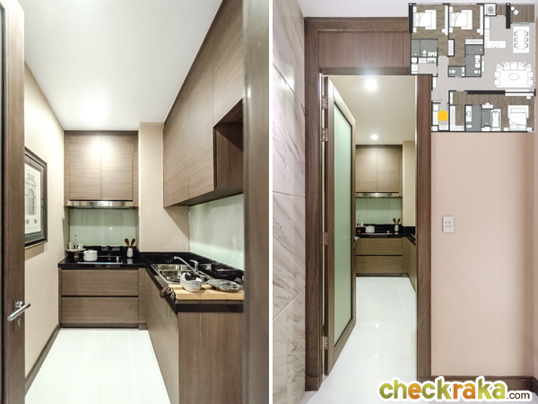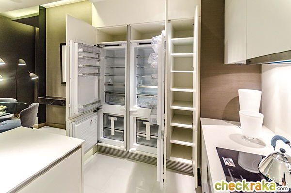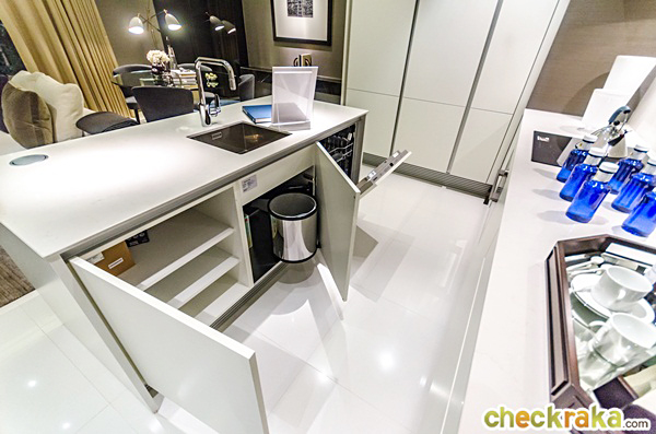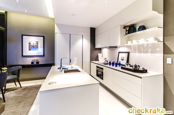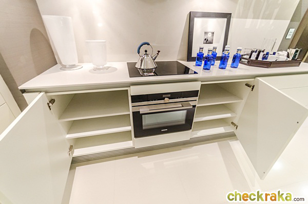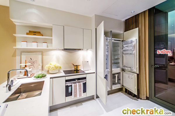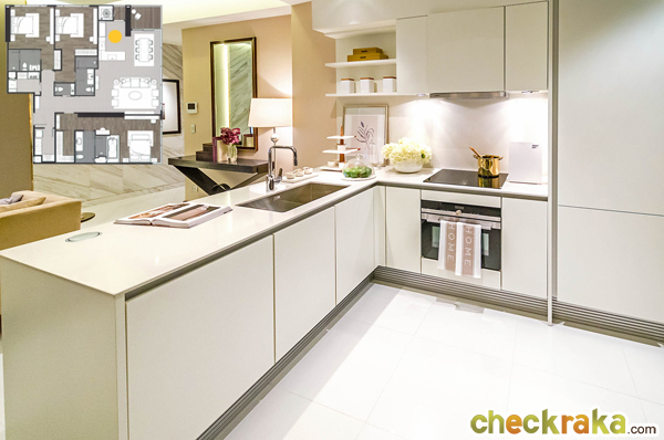 ห้องครัวได้วัสดุเหมือนกันกับ 2 ห้องนอน แต่ว่าห้องนี้จะเป็นแบบ L-Shape ขนาดใหญ่ขึ้น