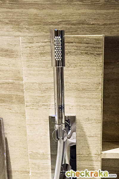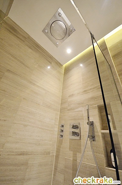 ห้องนี้ได้ Rain Shower แบบมาตรฐานไม่ได้ฝังฝ้า ผนังห้องน้ำเป็นหินอ่อนสังเคราะห์