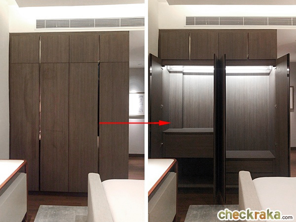 ตำแหน่งตู้เสื้อผ้าอยู่ทางขวามือบริเวณทางออกประตูห้อง พร้อมไฟภายในตู้เสื้อผ้า