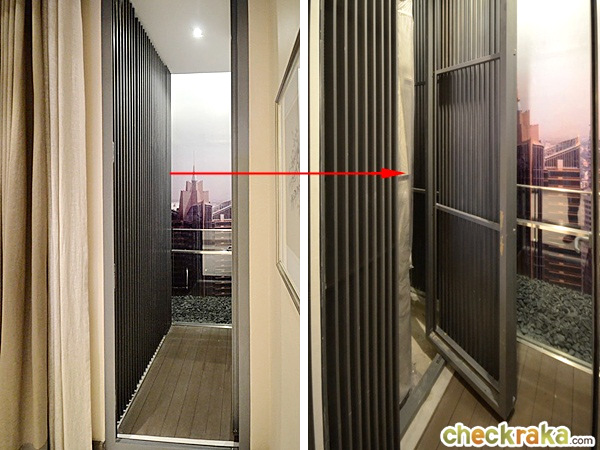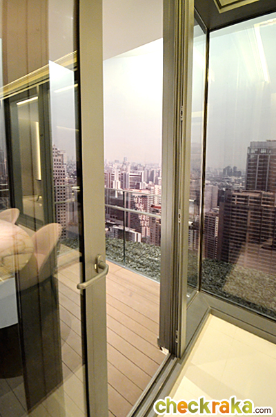 ประตูกระจกที่ระเบียงเป็นแบบบานเลื่อนทรงสูงเหมือนห้องที่แล้ว