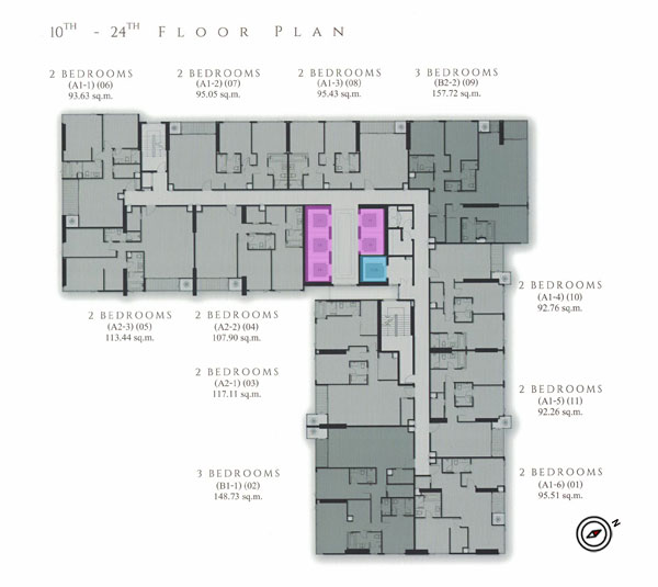 Floor Plan ชั้น 10 - ชั้น 24 : จะเหมือนกันคือ เป็นส่วนพักอาศัยทั้งหมด มียูนิตต่อชั้นอยู่ที่ 11 ยูนิต แบ่งเป็นห้องแบบ 2 Bedroom จำนวน 9 ยูนิต, และแบบ 3 Bedroom จำนวน 2 ยูนิต