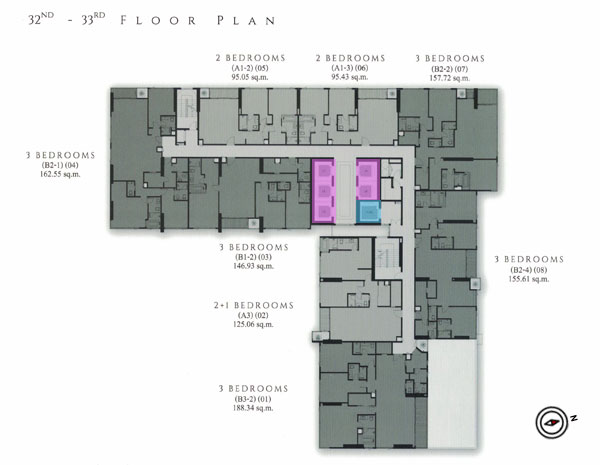 Floor Plan ชั้น 32 - ชั้น 33 : เป็นส่วนพักอาศัยทั้งหมด มีจำนวนยูนิตต่อชั้นลดลงมาเหลือ 8 ยูนิตต่อชั้นเท่านั้น แบ่งเป็นห้องแบบ 2 Bedroom จำนวน 2 ยูนิต, และแบบ 3 Bedroom จำนวน 6 ยูนิต