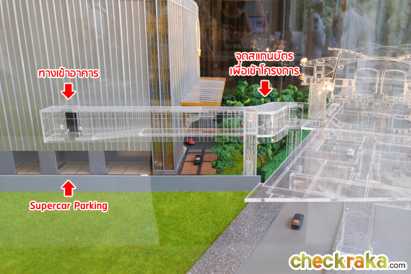 ส่วนใต้อาคารฝั่งทิศตะวันออกจะเป็นที่จอดรถซูเปอร์คาร์ (supercar parking) จอดได้ 8 คัน