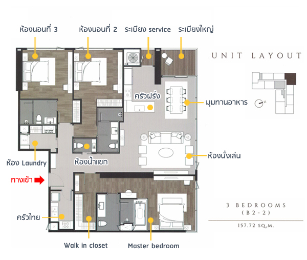 ห้องตัวอย่างแบบ 3 ห้องนอน ขนาด 157.72 ตร.ม. (3 ห้องนอน 3 ห้องน้ำ 1 ห้องน้ำแขก 2 ห้องครัว)