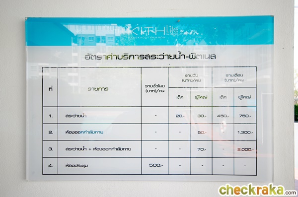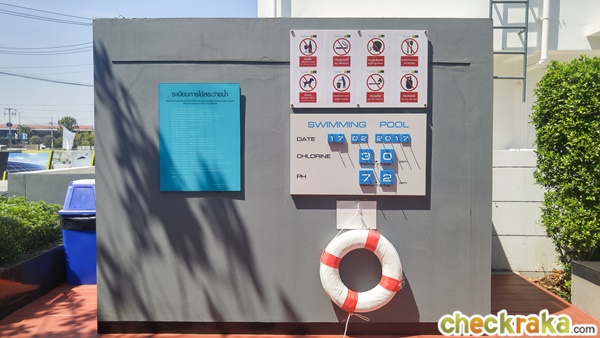 และมีป้ายบอกค่าคลอรีนภายในสระว่ายน้ำในแต่ละวันไว้ข้างสระ