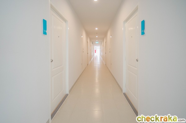 โถงทางเดินกว้าง 1.5 เมตร ผนังทาด้วยสีขาว บนเพดานติดไฟดาวน์ไลท์ทรงกลมมาให้ตลอดแนวทางเดิน