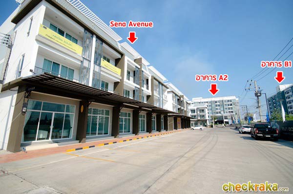 ขับเข้ามาจะเจอโครงการ Sena Avenue อยู่ทางด้านซ้ายมือ ทุกหลังจะติดตั้ง Solar Roof สามารถผลิตไฟฟ้าจากแสงอาทิตย์ใช้ฟรี ช่วยลดค่าไฟฟ้าไปในตัว ตรงไปเป็นอาคาร A2 และทางขวาคืออาคาร B1