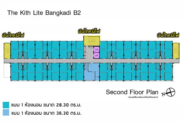อาคาร B2 ชั้น 2-7 : จะคล้ายกันคือเป็นพื้นที่พักอาศัยทั้งหมด เป็นห้องขนาด 28.30 ตร.ม. จำนวน 24 ยูนิต และมีห้องแบบ 1 ห้องนอน ขนาด 36.30 ตร.ม. เพิ่มขึ้นมาอีก 1 ห้อง จึงทำให้จำนวนห้องพักอาศัยต่อชั้นขยับมาอยู่ที่ 25 ยูนิต/ชั้น