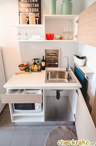 ด้านล่างได้ลิ้นชักสำหรับเก็บช้อนส้อม ช่องวางไมโครเวฟ และช่องเก็บของใต้อ่างล้างจาน