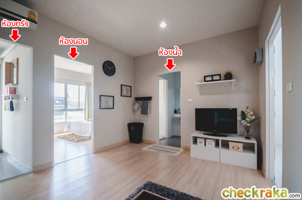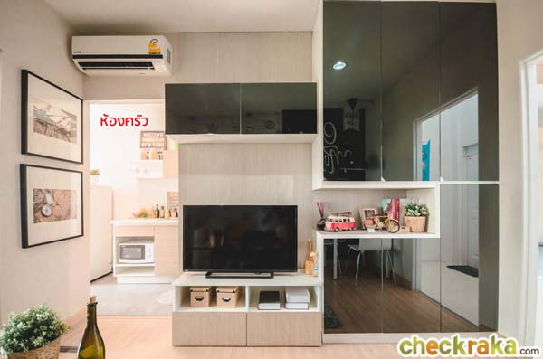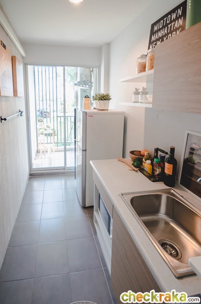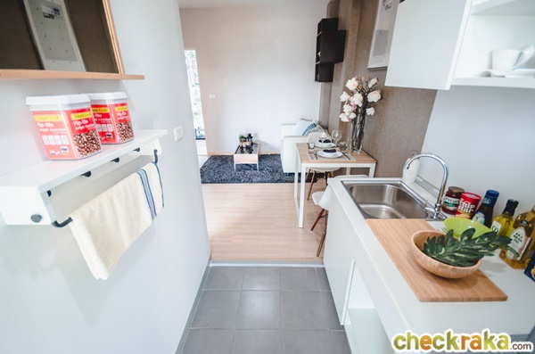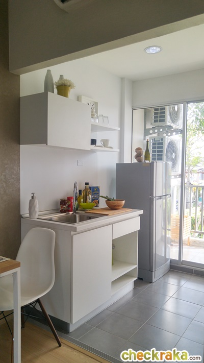 ห้องครัวเป็นแบบเปิดไม่มีประตูกั้นเช่นเคย อยากได้ต้องติดเพิ่มเอง