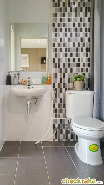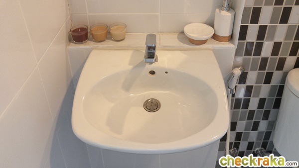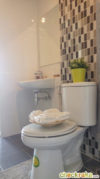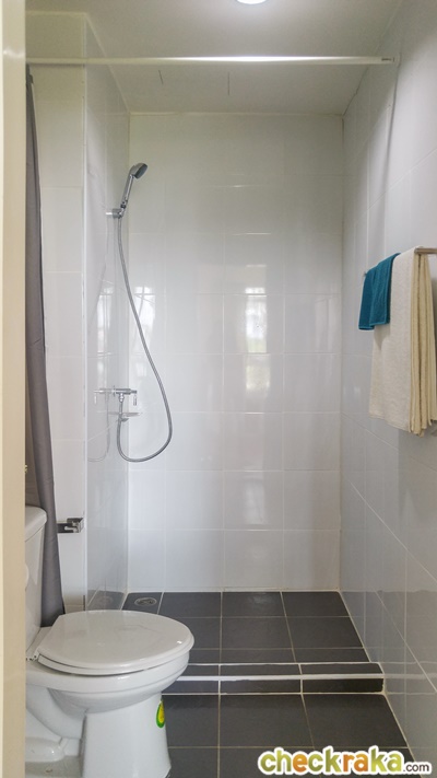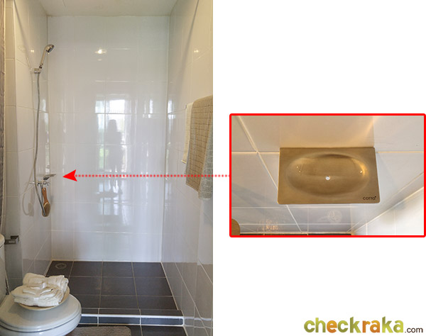 ในห้องน้ำแบ่งพื้นที่ส่วนเปียกส่วนแห้งไว้ให้ ก่อธรณีสูงประมาณ 5 ซม. แต่ไม่มีฉากกั้นอาบน้ำให้
