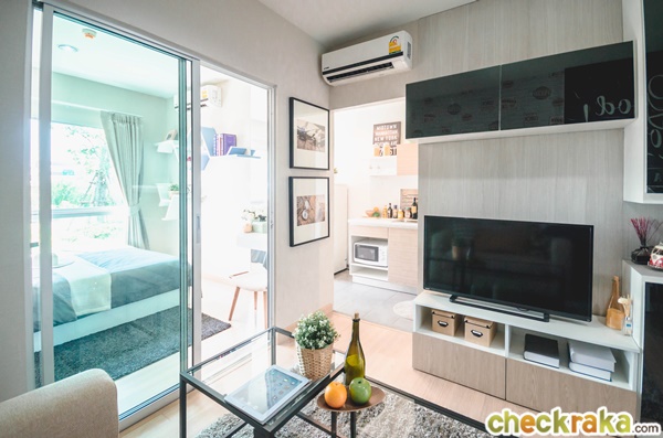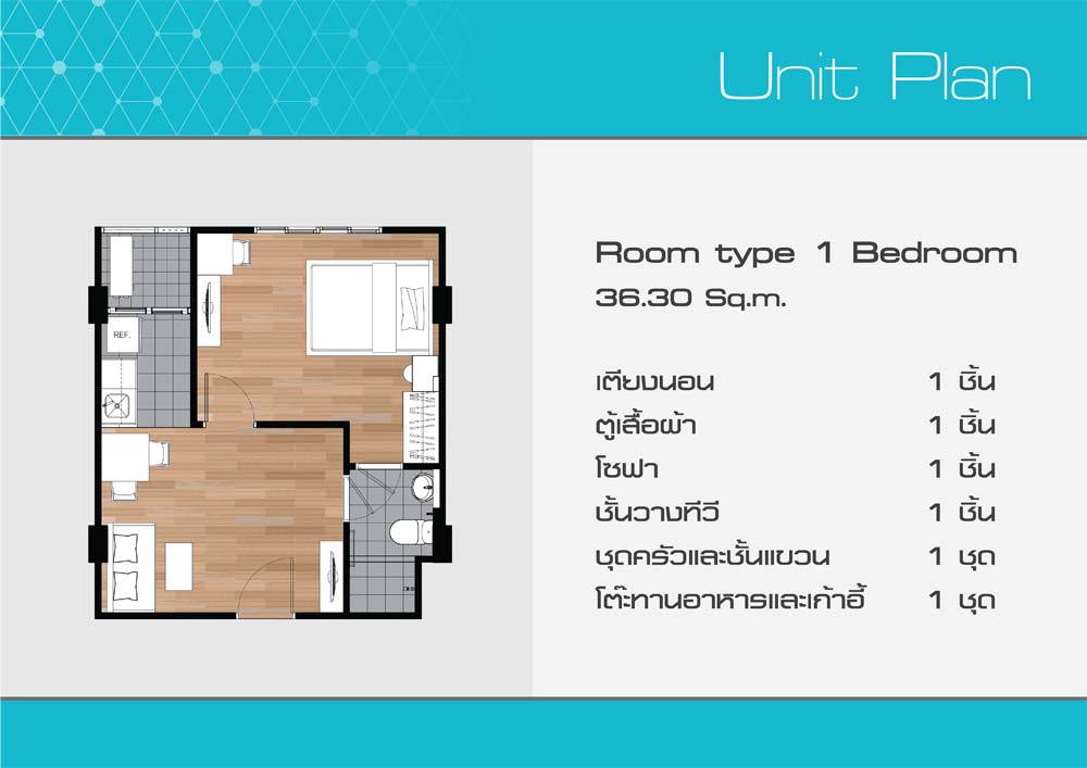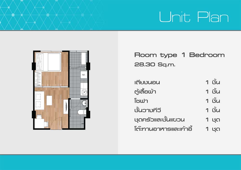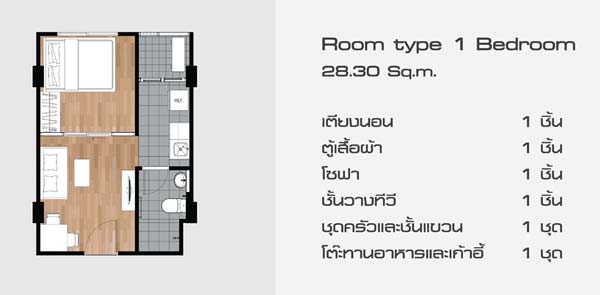 - ห้องแบบ 1 ห้องนอน (1 ห้องนอน, 1 ห้องน้ำ, 1 ห้องนั่งเล่น, ห้องครัวเปิด) - เนื้อที่ 28.30 ตร.ม.