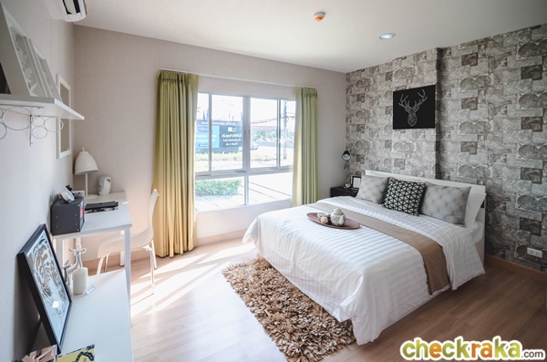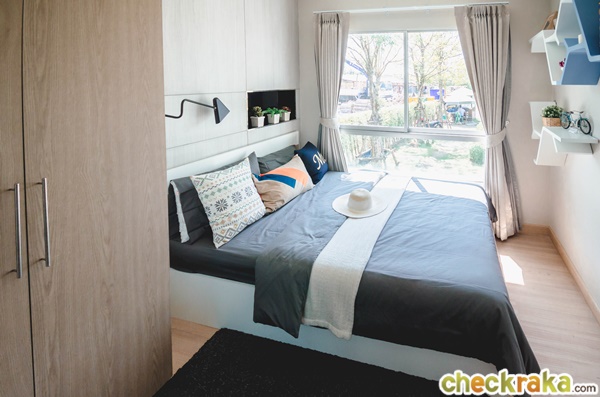 ภายในห้องนอนได้เตียงขนาด 5 ฟุต ตั้งชิดหน้าต่าง พื้นที่ปลายเตียงเหลือประมาณ 60 ซม.