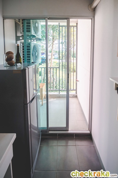 ระเบียงจะอยู่ทางด้านซ้ายของครัว ประตูระเบียงเป็นกระจกใสแบบบานเลื่อน 2 ตอนกึ่งติดตาย