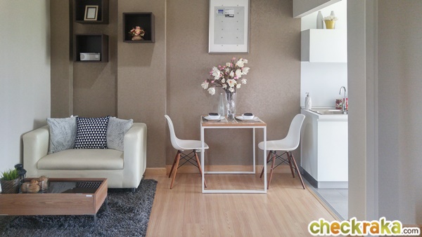 ได้โต๊ะทานอาหารขนาด 80 x 80 ซม. พร้อมเก้าอี้ 2 ตัว วางชิดเข้ามุม และโซฟาสีน้ำตาลอ่อนขนาด 2 ที่นั่ง
