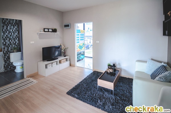 พื้นที่บริเวณหน้าห้องมีตู้สำหรับวางของ และมีพื้นที่ค่อนข้างกว้างสามารถปูเสื่อเล่นโยคะได้