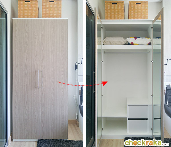 ได้ตู้เสื้อผ้าบานเปิดเหมือนห้องที่แล้ว ตั้งอยู่บริเวณด้านหน้าทางเข้าห้องน้ำ
