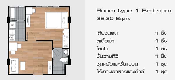 (คลิกเพื่อชมแปลนห้อง) - ห้องแบบ 1 ห้องนอน (1 ห้องนอน, 1 ห้องน้ำ, 1 ห้องนั่งเล่น, ห้องครัวเปิด) - เนื้อที่ 36.30 ตร.ม.