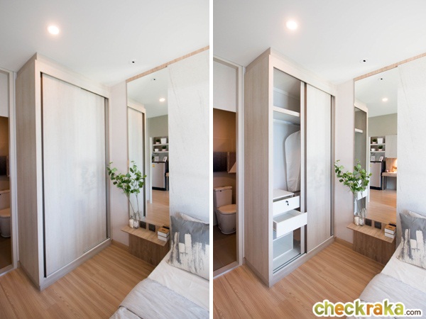 ได้ตู้เสื้อผ้าบานเปิดหน้ากว้าง 90 ซม. อยู่ทางขวา และแอร์อีก 1 ตัวอยู่เหนือประตูระเบียง