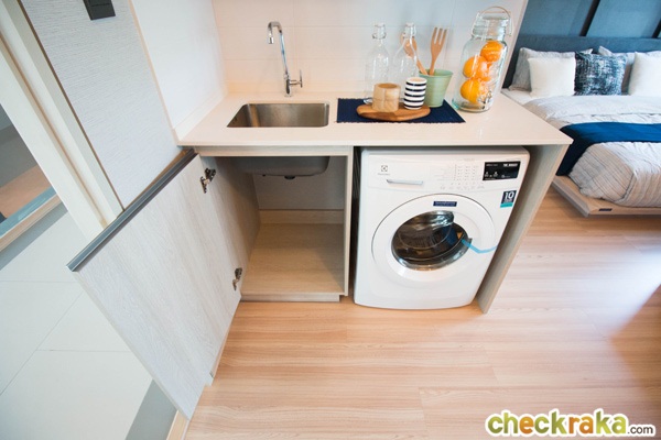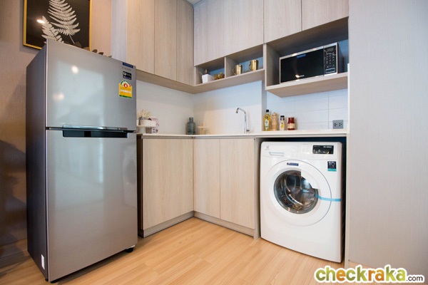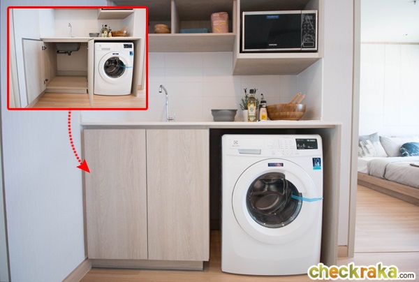 พื้นที่เตรียมอาหาร และที่เก็บของก็เยอะขึ้นตามไปด้วย ที่วางเครื่องซักผ้ายังคงวางตู้ใต้เคาน์เตอร์ครัว